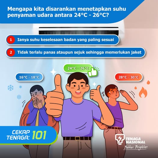 Menurut kajian, suhu 24°C – 26°C pada penyaman udara adalah paling ideal—cukup nyaman untuk badan dan optimum untuk penjimatan tenaga! ![]()