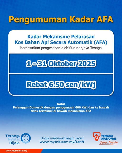 Kadar AFA diterbitkan di portal myTNB, layari pautan http://www.mytnb.com.my/tariff untuk maklumat lanjut dan untuk mengetahui kadar pelarasan AFA bulanan.