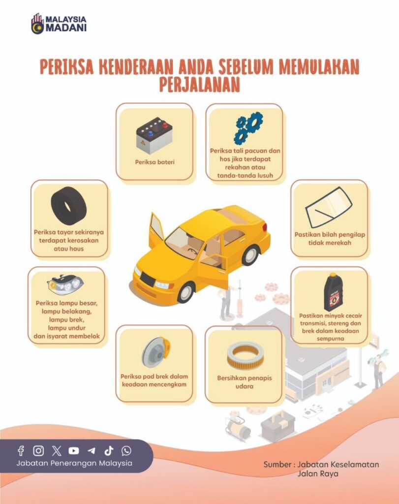 Sebelum mulakan perjalanan jauh, jangan lupa periksa bateri, brek, minyak enjin, tayar dan lampu kenderaan.